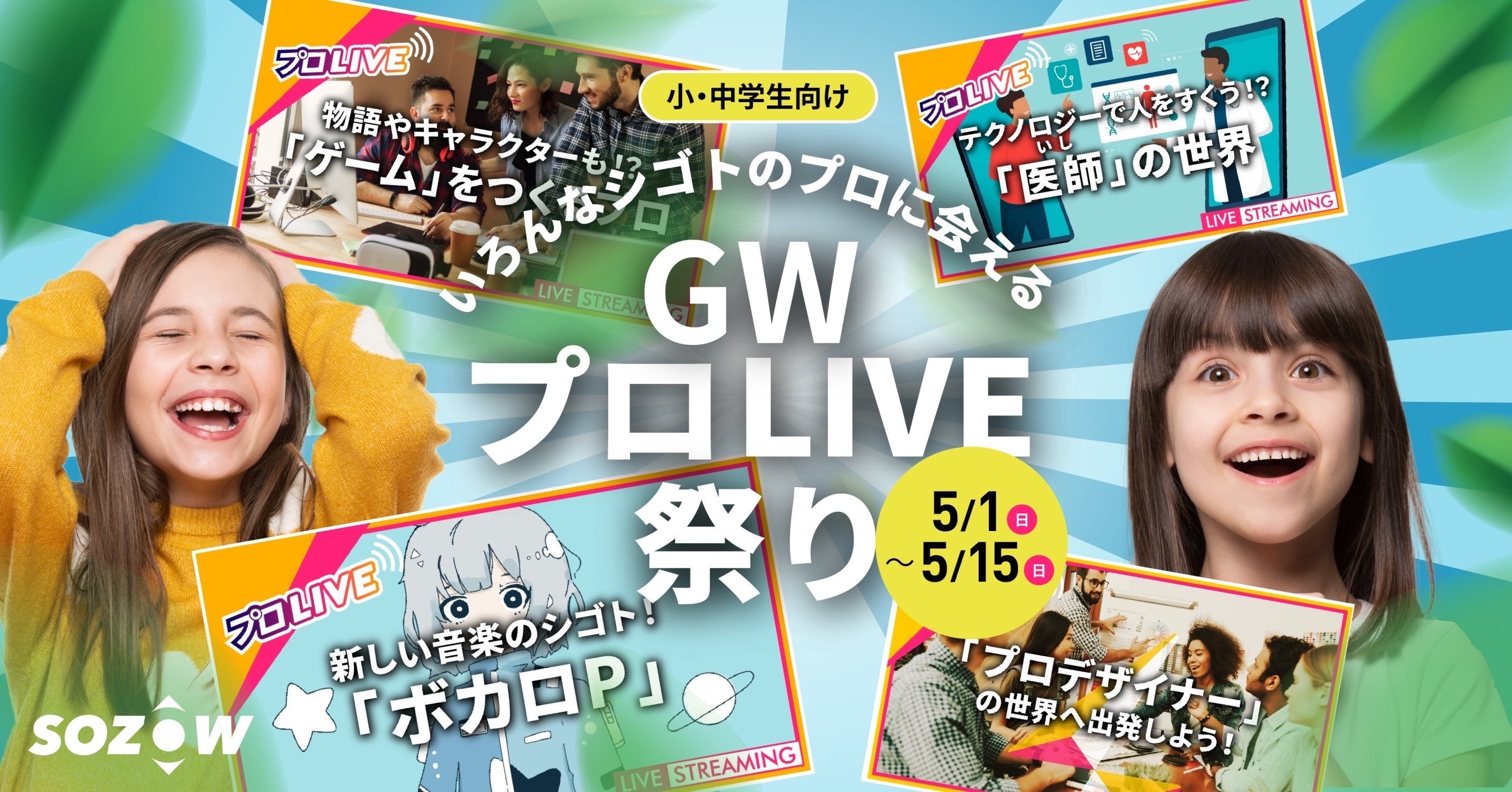 Go Visions株式会社(所在地:東京都品川区、代表取締役:小助川 将)が運営する小・中学生向けオンラインの学び場「SOZOW(ソーゾウ)」は、5月1日(日)から5月15日(日)の間、ボカロP・ゲームプランナー・デザイナー・医師の4名のプロをゲストにお迎えし、それぞれにシゴトについて子どもたちが直接お話を聞ける特別イベント「GWプロLIVE祭り」を開催します。