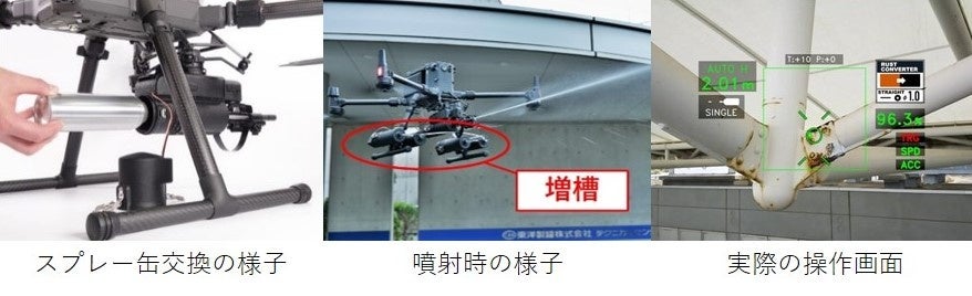 これまで空撮が主な用途であったドローンに対し、新たに作業力を与えることで、足場レスの高所作業を実現します。防錆剤やコンクリートの表面含浸剤による構造物の軽補修作業や、点検時のマーキング作業、忌避剤による鳥害対策など、スプレー缶を交換するだけで幅広い目的で使用することができます。また、スプレー缶を追加搭載できる補助噴射装置「増槽」を取り付け、噴射容量を増大させることも可能です。
