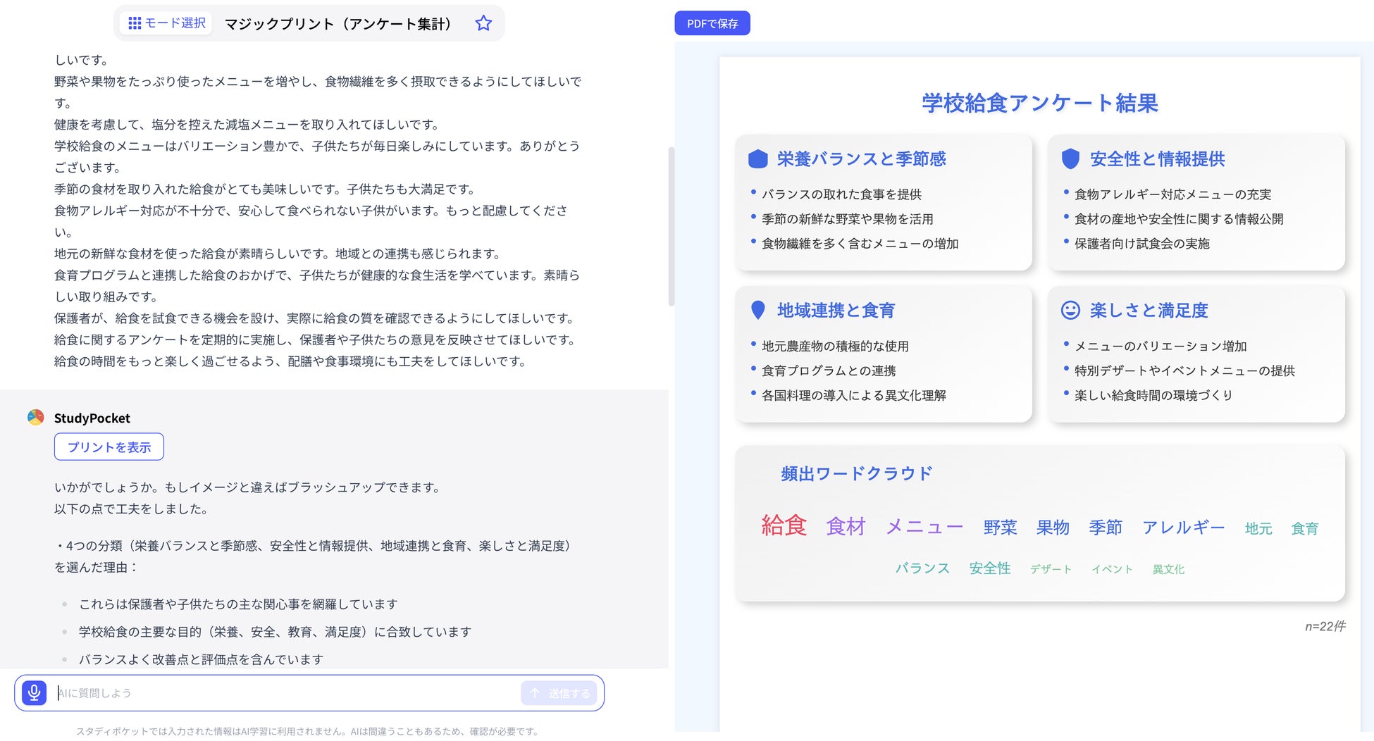 新機能「マジックプリント」(商標、特許出願中) では、単元テーマや指導案を入れるだけで、教材プリント・授業用スライド・板書計画・小テストなどの草案を図解を含む生成を行います。小学校1年生から高校生の大学受験ニーズまで幅広く対応し、特別支援学校・学級での個別の指導計画などの作成も支援いたします。また、教務関連に限らず、自由記述のアンケート結果を入れると分析結果を表示したり、校務や事務作業でも活用いただけます。