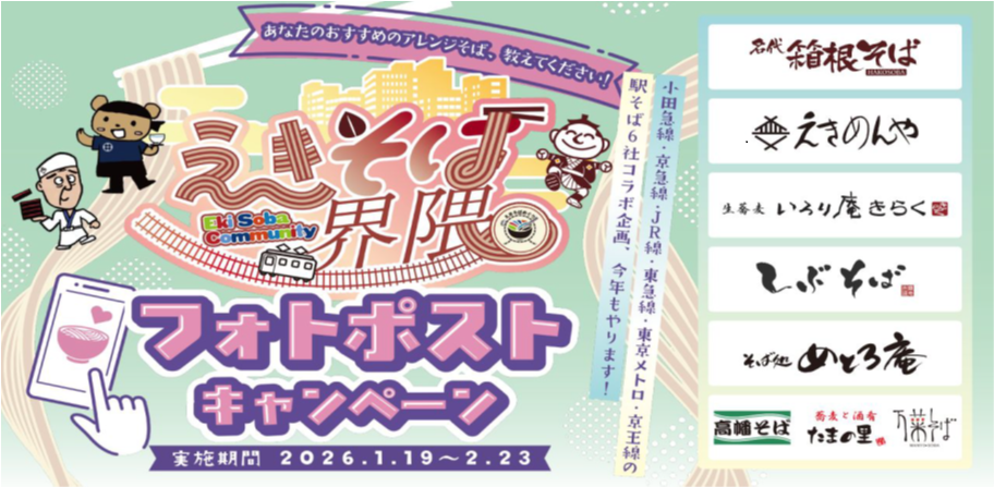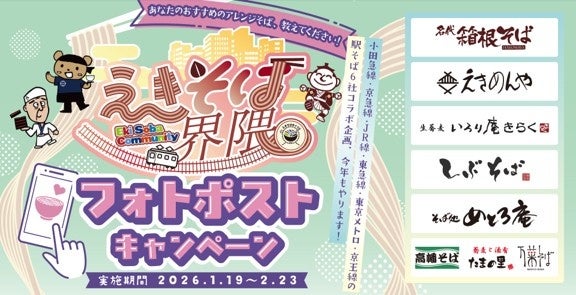 関東沿線で駅のそば屋を運営する6社は、駅ならではの食文化の一つである「駅そばの魅力」を伝え、駅そばのファンを増やすことを目的に1月19日(月)~2月23日(月・祝)まで「えきそばめぐり第4弾 えきそば界隈 フォトポストキャンペーン」を共同開催します。