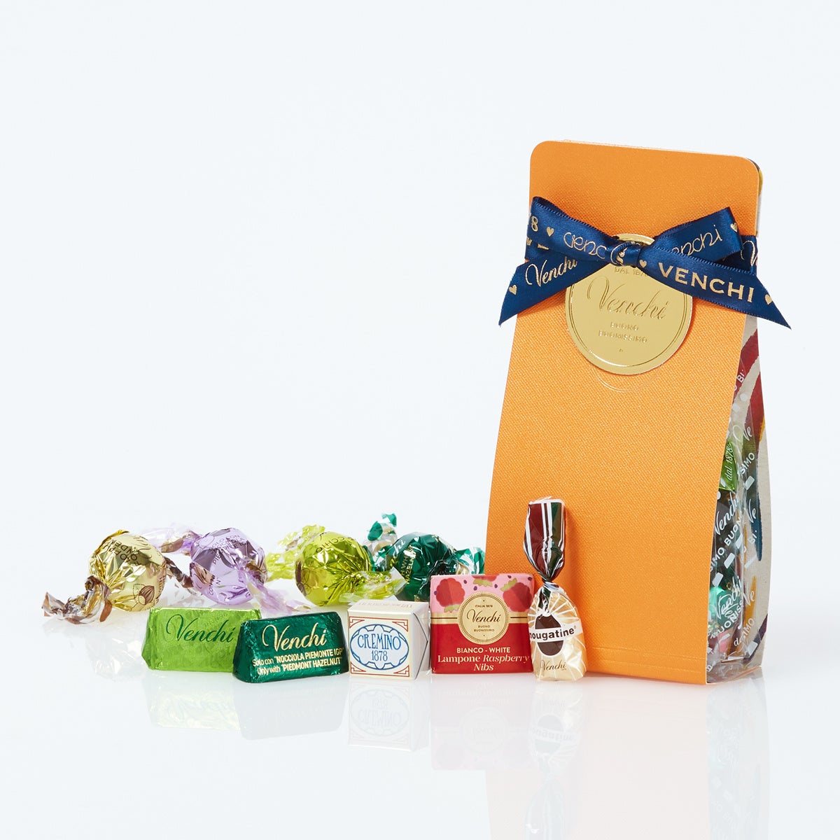鮮やかなオレンジ色のスリーブバッグ。 My Venchi Mixで人気のチョコレートの詰め合わせで、Venchiのチョコレートをはじめて贈る時のギフトにもおすすめです。(9種11粒入り)
