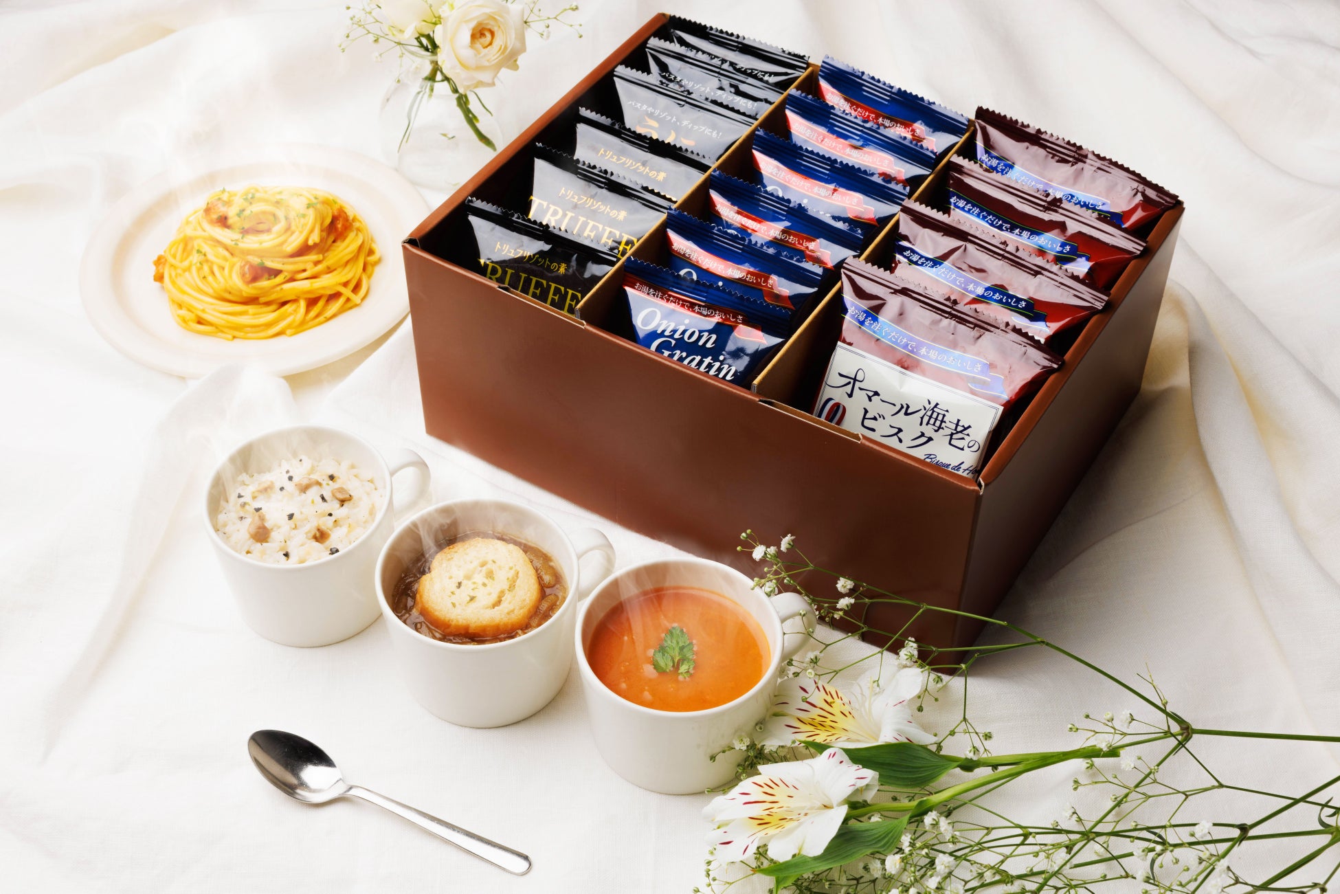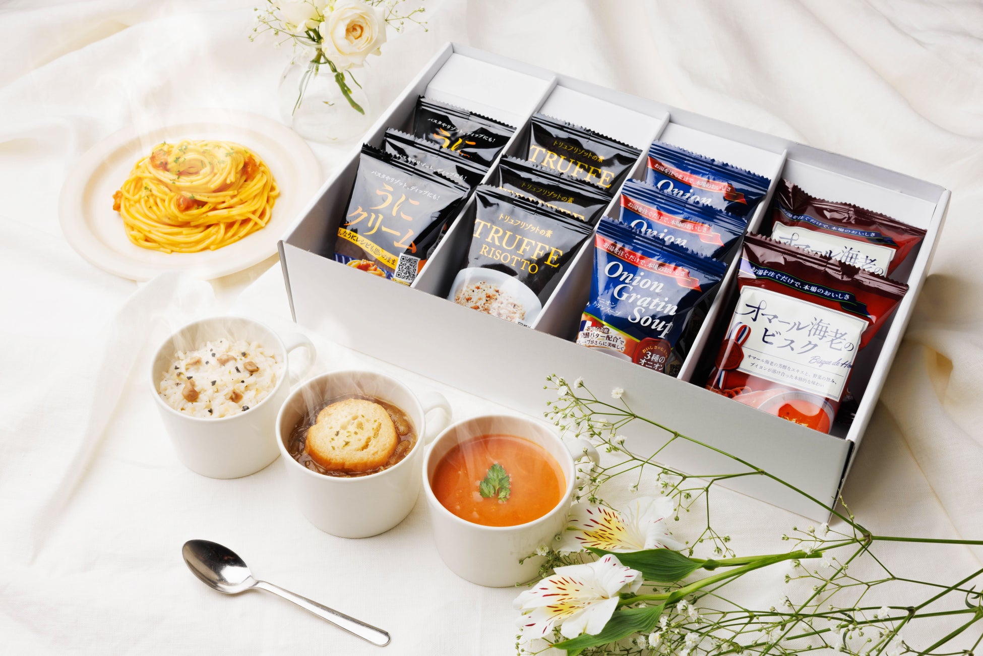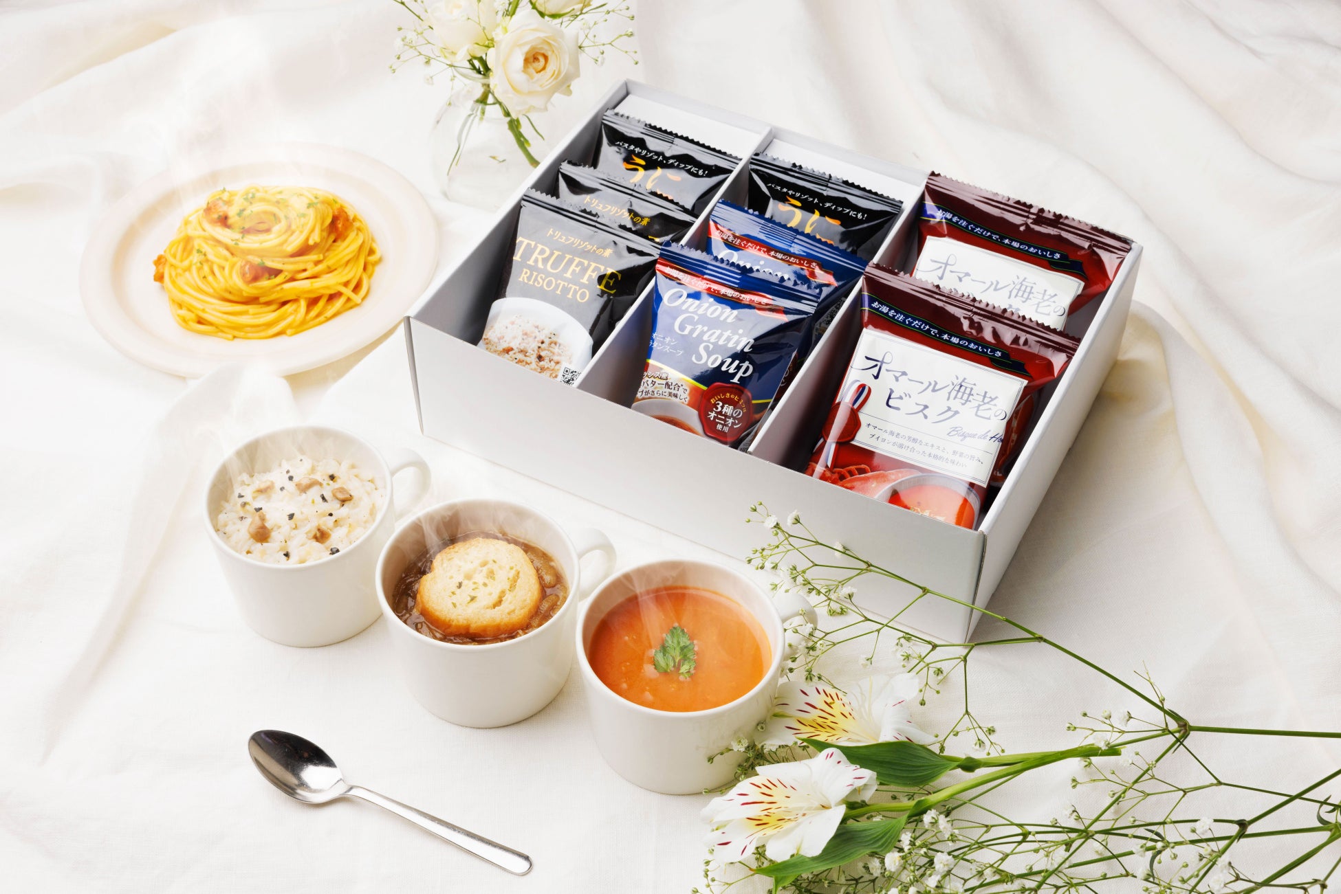 お湯をかけるだけの簡単調理でレストラン級の1品ができるアイテムがそろっているので、仕事や子育てなどで忙しい方への贈り物にもおすすめです。ぜひ、大切な人とおいしい時間を共有してください。
