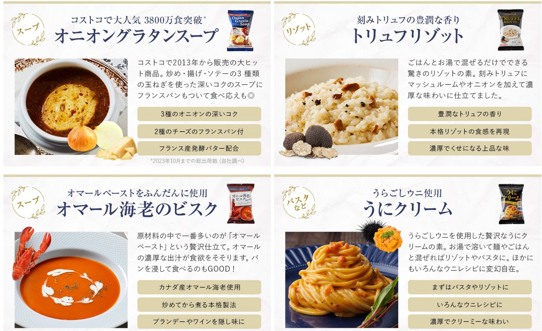 コストコで人気のロングセラー「オニオングラタンスープ」をはじめとした、高級感あふれる料理を楽しめる「オマール海老のビスク」「トリュフリゾットの素」「うにクリーム」がアソートになった、おトクでうれしいギフトセットです。