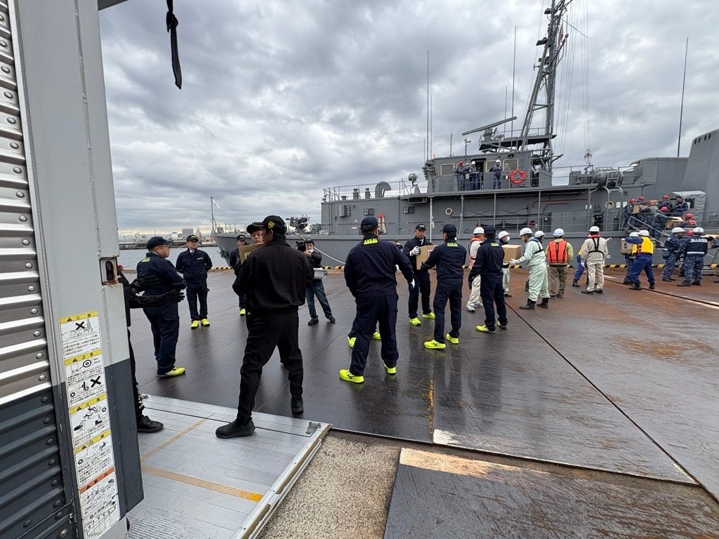 サカイ引越センターは、引越トラックを活用し、耐震強化岸壁に着岸した海上自衛隊「あおしま」から緊急支援物資をトラックに積込、防災拠点内の荷捌地に運搬しました。また、エアーテント内の決められた位置に緊急支援物資の一部を積み下ろし、サカイ引越センターのトラック3台が、北側護岸へ移動し、近畿運輸局の船「きんき」へ緊急支援物資を積み込みました。
