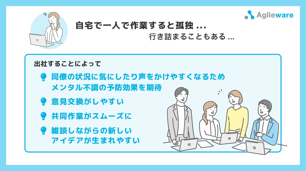 個人の作業だけを思えば、フルリモートワークを継続したい人もいるかもしれません。しかし、全ての仕事は一人だけでできるものではなく、チーム内外の支え合いが必要なことが必ずあります。