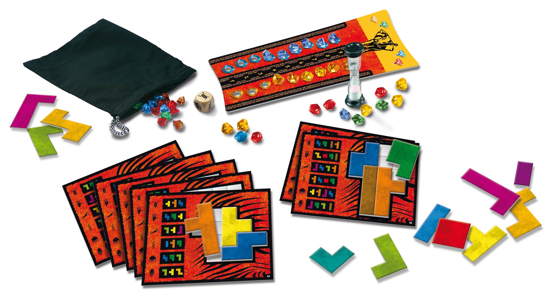 パズルピース 12種×4人分、パズルボード54枚、宝石コマ58個、ダイス1個、砂時計1個、ラウンドトラックボード1個、袋1枚、説明書