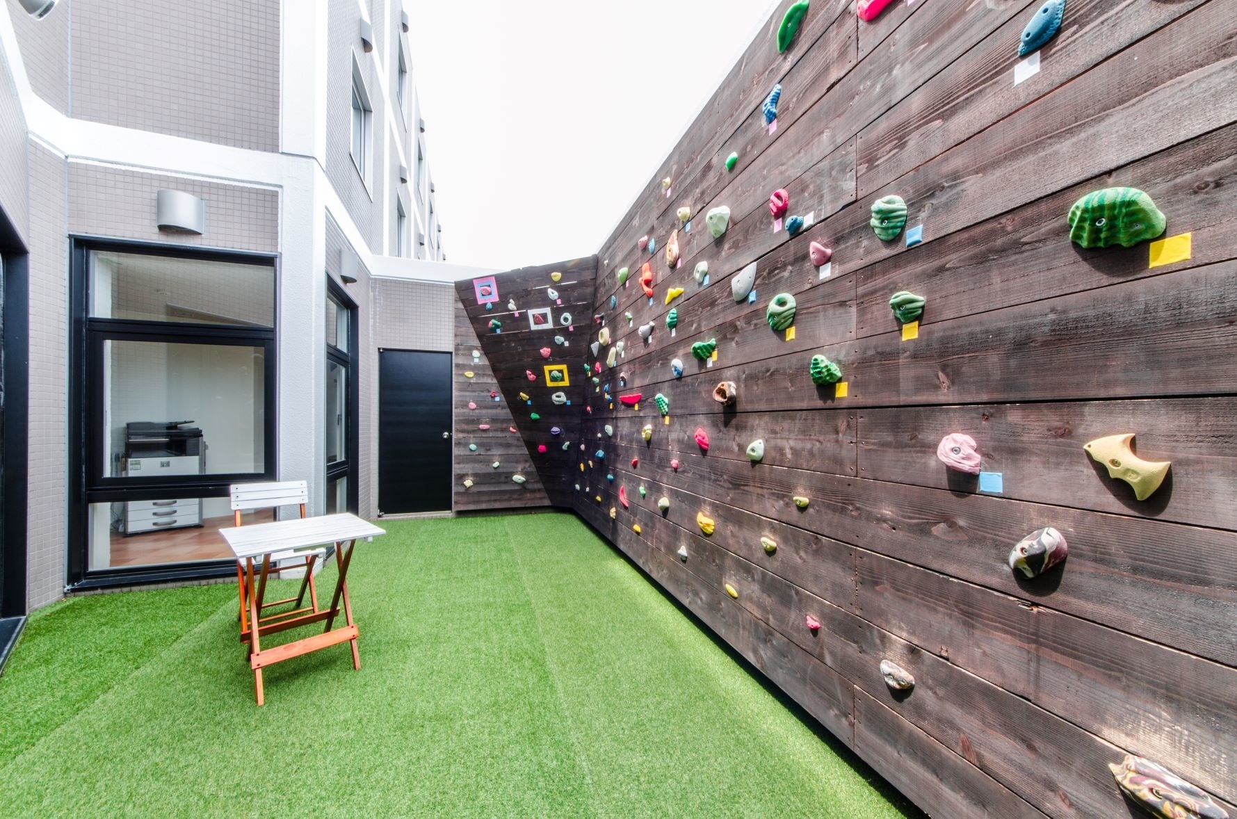 壁いっぱいに自由に楽しめるボルダリングを設置しました。