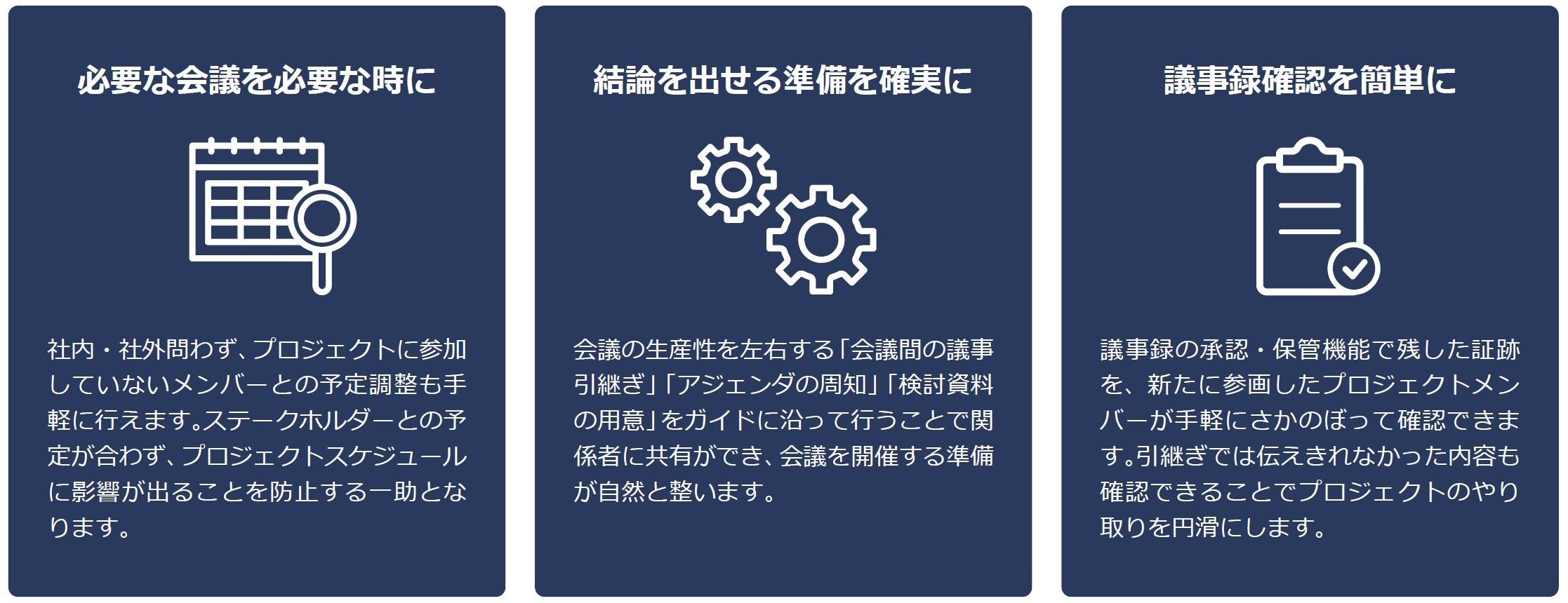 会議調整では空き時間をレコメンドする機能により容易な調整を実現、会議中は事前に設定したアジェンダに沿って会議の進行をサポート、議事メモを更新しながらタスク登録も実施できるなど、一連の流れに沿ってプロジェクトの進行をサポートします。