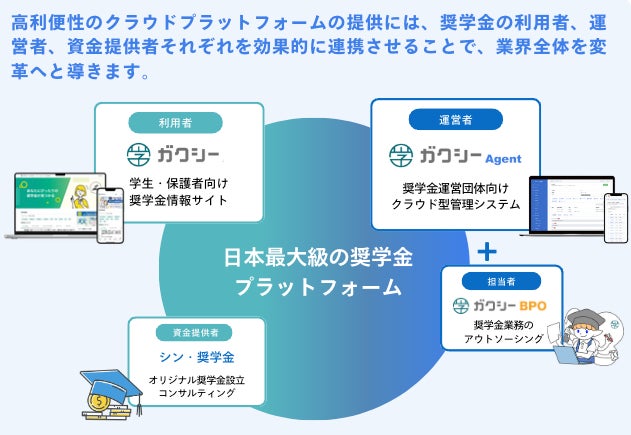株式会社ガクシーは若者の可能性を広げる新しいお金の流れを創造する事業を行っています。経済的な理由で夢を諦めることのない、さらには、挑戦者が世の中を変革し、牽引していけるような社会の実現を目指しています。具体的には、奨学金の利用者である学生や保護者向けに日本最大級の奨学金情報サイト「ガクシー」を運営し、学校・地方自治体・財団などの奨学金運営団体向けにはクラウド型奨学金運営管理システム「ガクシーAgent」およびBPO(業務支援)を提供しています。また、資金を提供したい個人や団体向けに簡単に少額から奨学金を創設できるサービス「シン・奨学金」や「奨学金コンサルティング」、企業向けに奨学金を活用した「学生採用・集客支援サービス」も提供しています。これらの取り組みを通して、奨学金業界全体の変革を推進しています。