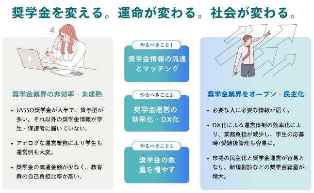 事業内容: 奨学金に関連するDX推進事業および利用者向けの情報提供、オリジナル奨学金設立サポ ート、学生集客支援