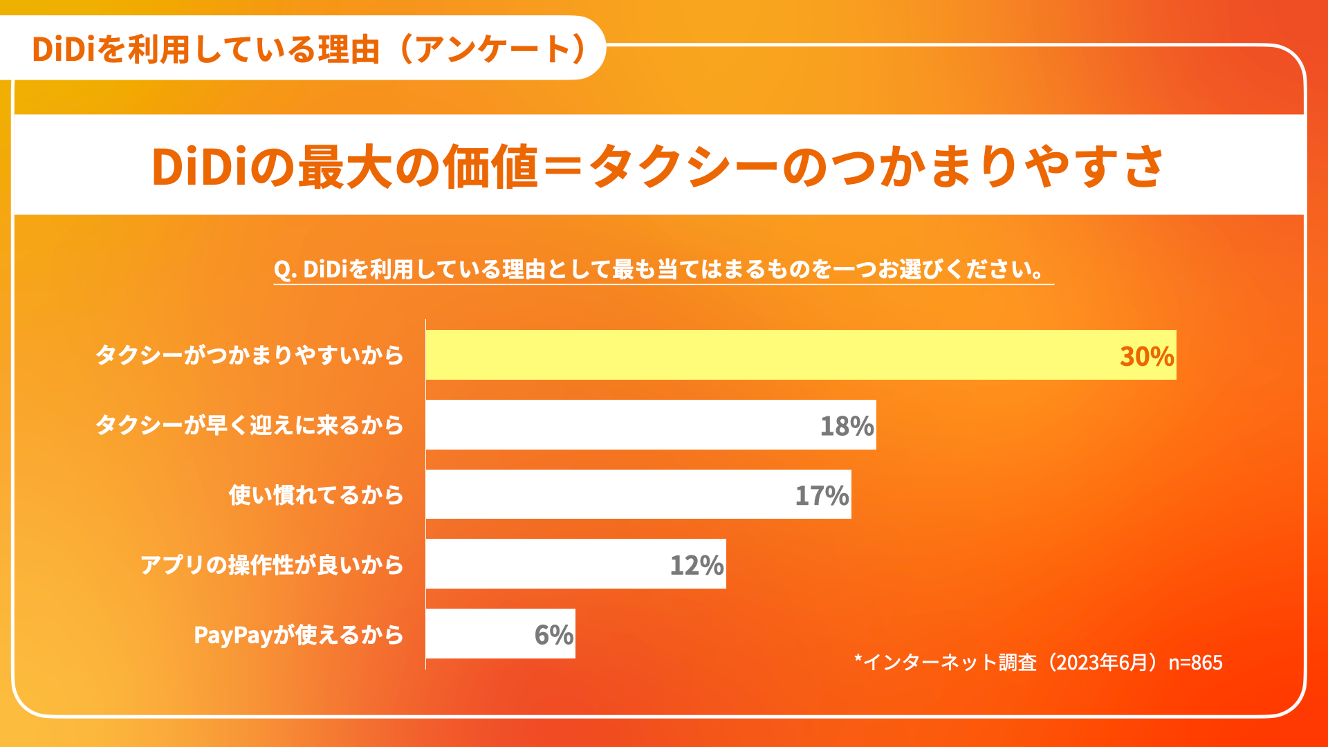実際に、「DiDi」を利用しているお客様に対して行ったアンケートでは、「DiDi」を利用している理由として、最も多くの人が「タクシーがつかまりやすいから」と回答しています。従来の場合、隠れたお客様を見逃してしまうことがありましたが、アプリを使うことで隠れた需要が可視化され、多くのお客様がタクシーを利用できるようになることが理由として挙げられます。