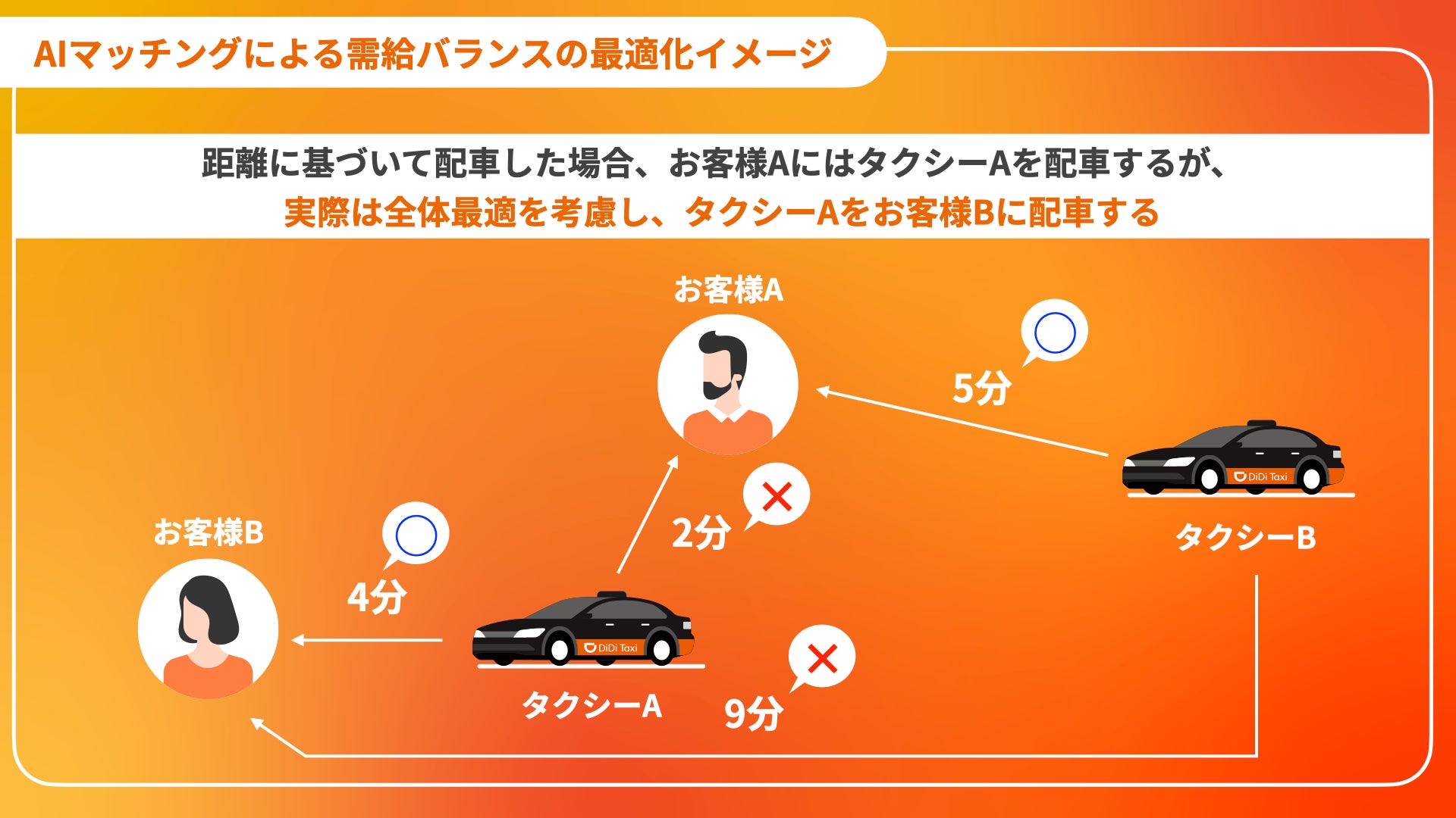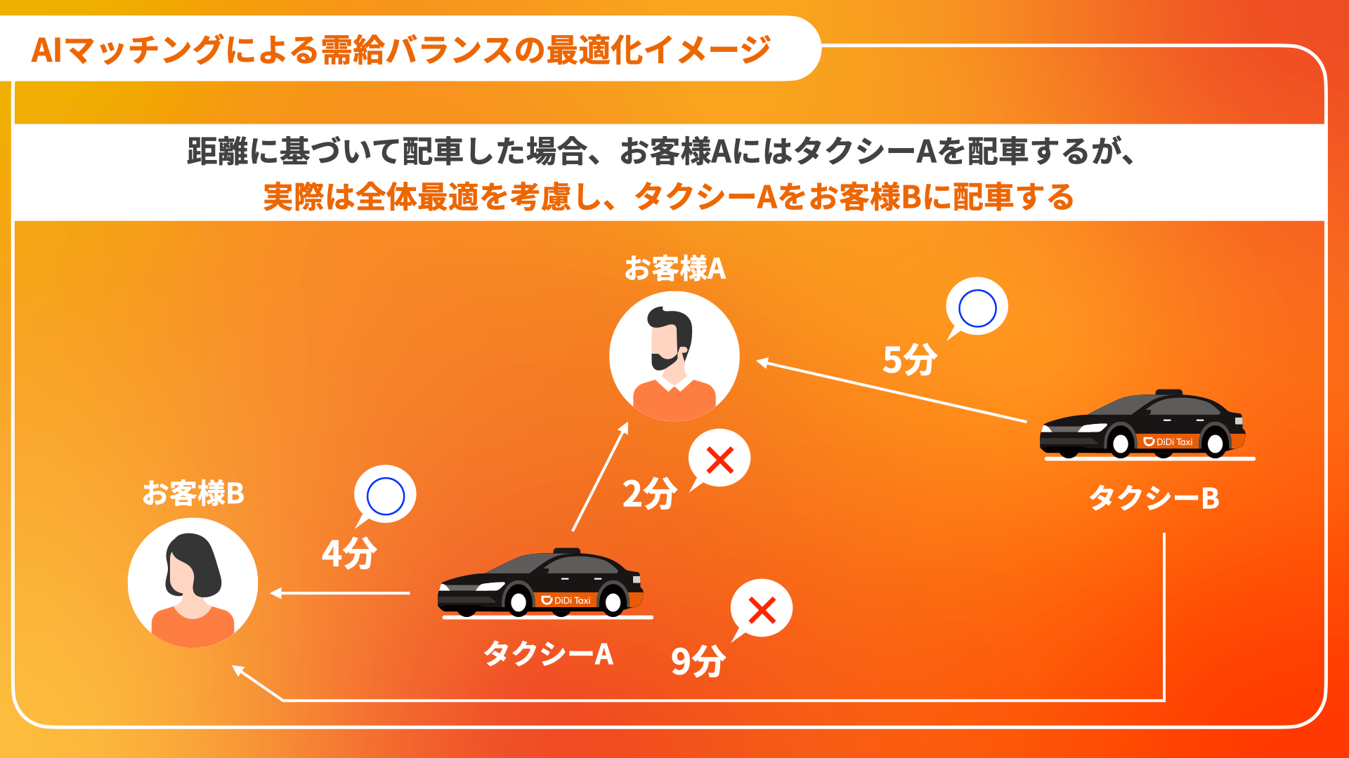 また、「DiDi」ではAIマッチングを活用して、周囲のお客様の注文状況やタクシーの供給状況に基づいて最適なタクシーを提供しています。これにより、プラットフォーム全体の供給と需要のバランスが最適化され、できる限り多くのお客様にタクシーサービスを提供することができています。