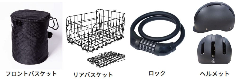 ●オプションアイテムで拡張性を提供。着用を強く推奨するヘルメットで自身の安全を確保。フロント/リアのバスケットは通勤・通学や買い物などに重宝します。盗難防止のロック(番号錠)も用意。
