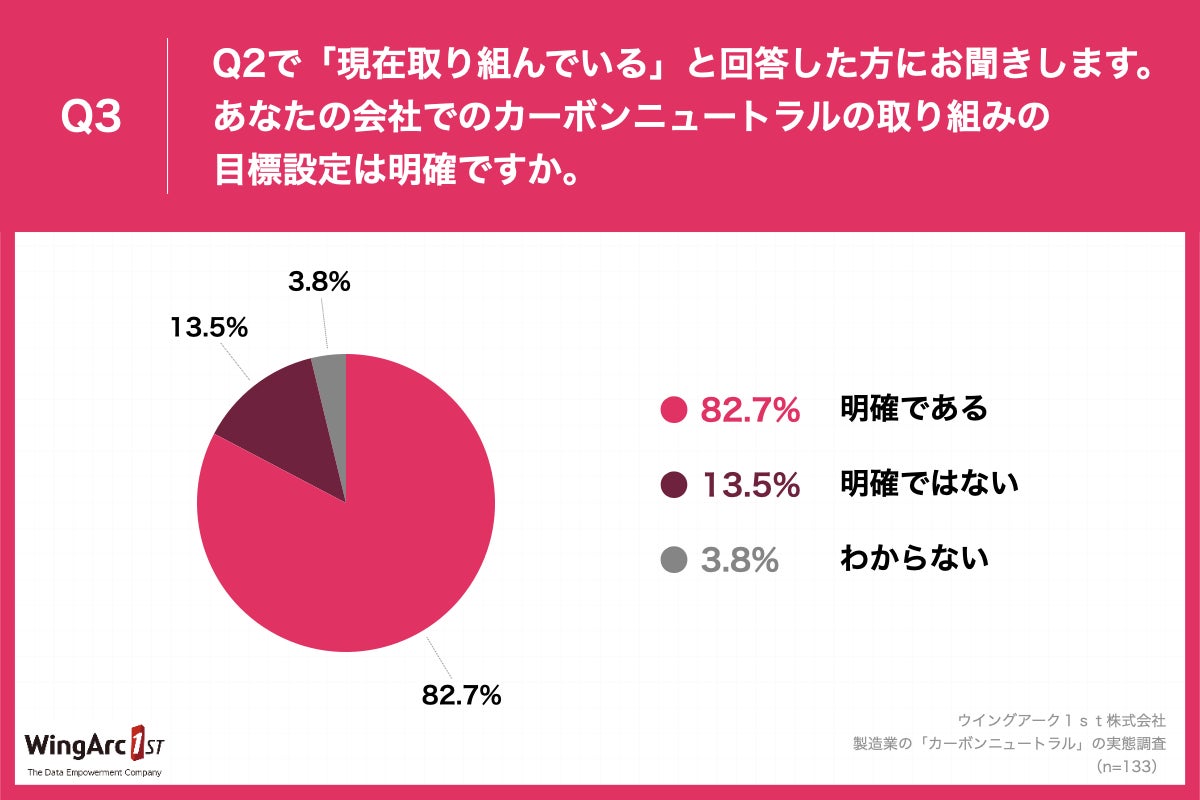 Q2で「現在取り組んでいる」と回答した方に、「Q3.あなたの会社でのカーボンニュートラルの取り組みの目標設定は明確ですか。」(n=133)と質問したところ、「明確である」が82.7%、「明確ではない」が13.5%という回答となりました。