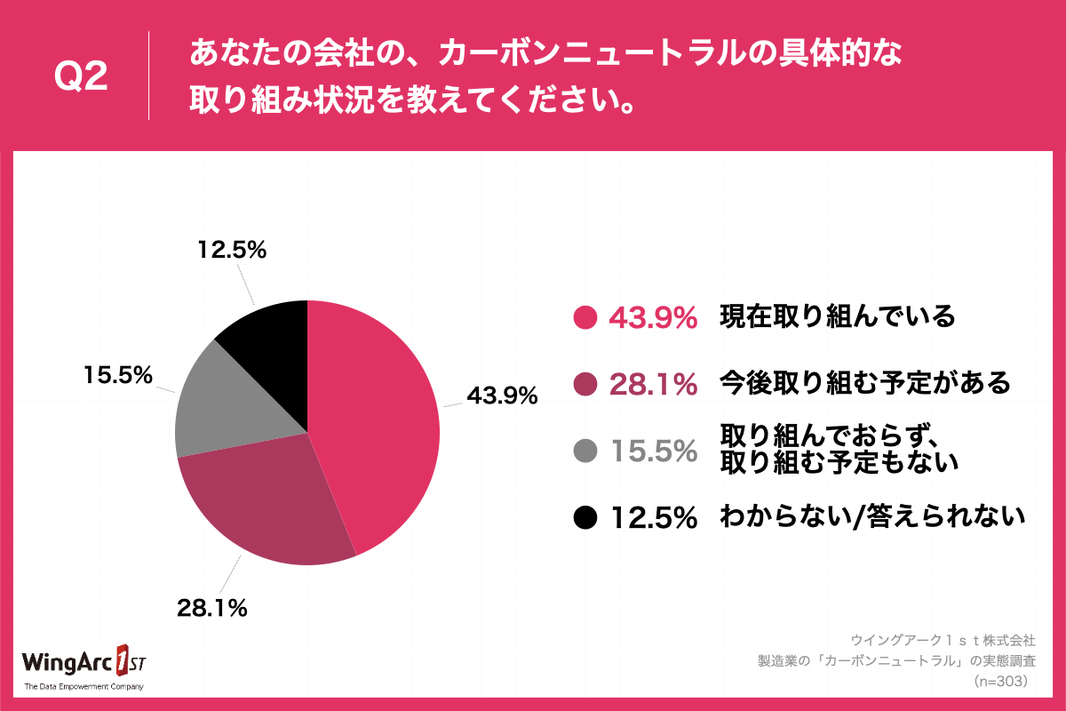 「Q2.あなたの会社の、カーボンニュートラルの具体的な取り組み状況を教えてください。」(n=303)と質問したところ、「現在取り組んでいる」が43.9%、「今後取り組む予定がある」が28.1%という回答となりました。