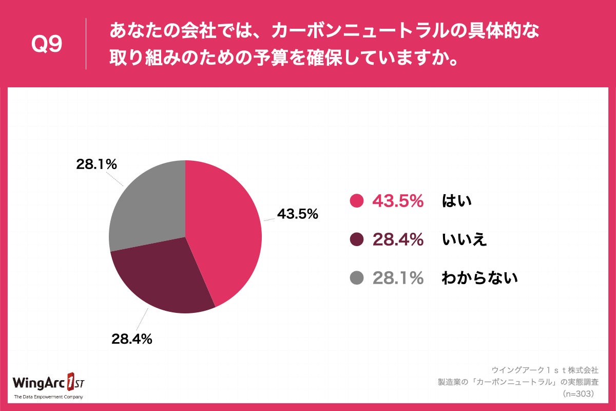 「Q9.あなたの会社では、カーボンニュートラルの具体的な取り組みのための予算を確保していますか。」(n=303)と質問したところ、「はい」が43.5%、「いいえ」が28.4%という回答となりました。