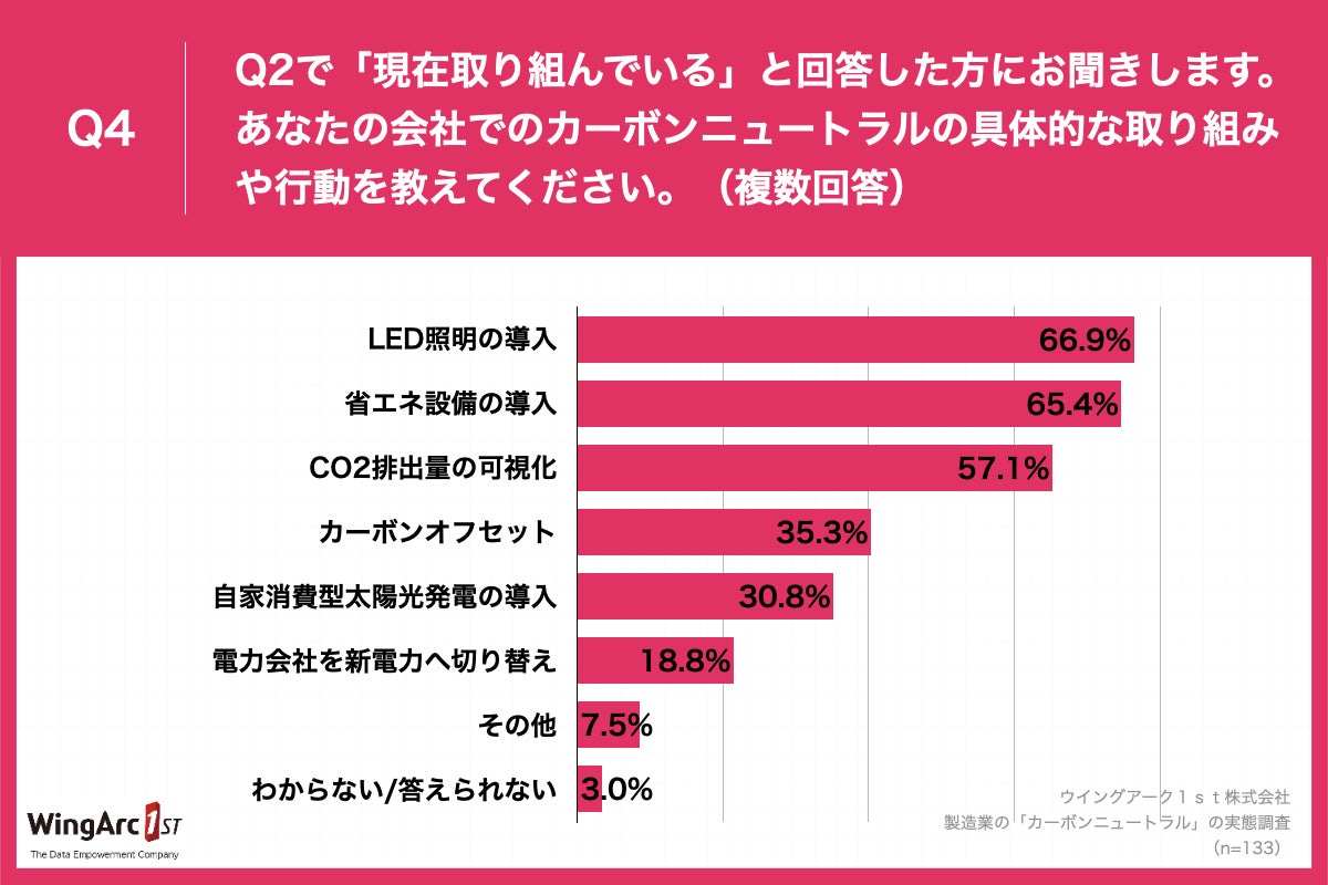 Q3で「現在取り組んでいる」と回答した方に、「Q4.あなたの会社でのカーボンニュートラルの具体的な取り組みや行動を教えてください。(複数回答)」(n=133)と質問したところ、「LED照明の導入」が66.9%、「省エネ設備の導入」が65.4%、「CO2排出量の可視化」が57.1%という回答となりました。