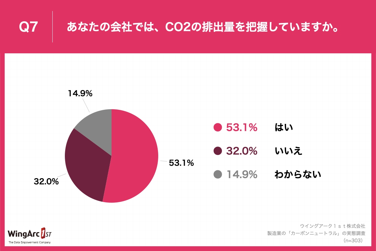 「Q7.あなたの会社では、CO2の排出量を把握していますか。」(n=303)と質問したところ、「はい」が53.1%、「いいえ」が32.0%という回答となりました。