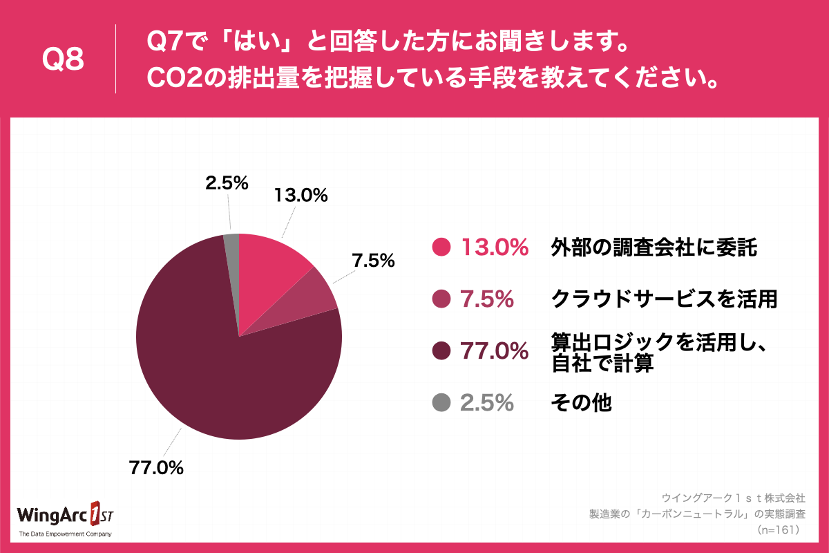 Q7で「はい」と回答した方に、「Q8.CO2の排出量を把握している手段を教えてください。」(n=161)と質問したところ、「外部の調査会社に委託」が13.0%、「算出ロジックを活用し、自社で計算」が77.0%という回答となりました。