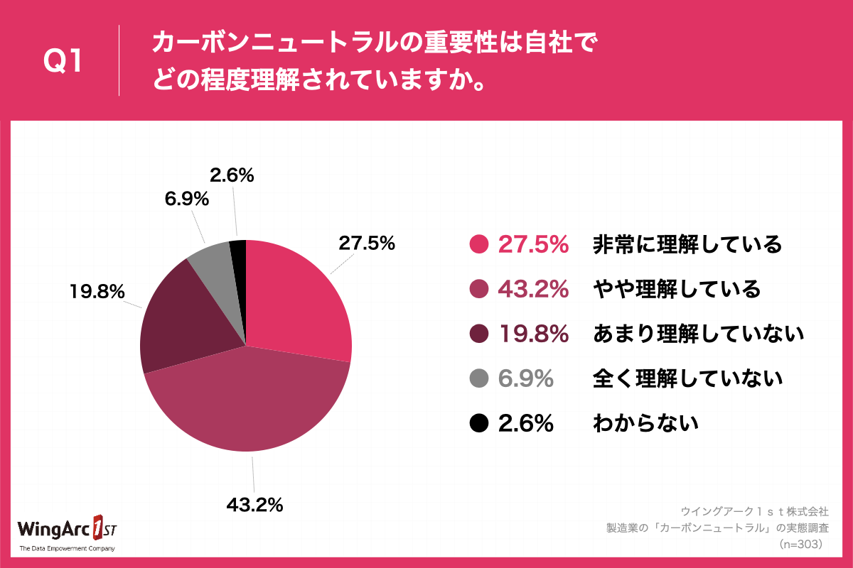 「Q1.カーボンニュートラルの重要性は自社でどの程度理解されていますか。」(n=303)と質問したところ、「非常に理解している」が27.5%、「やや理解している」が43.2%という回答となりました。