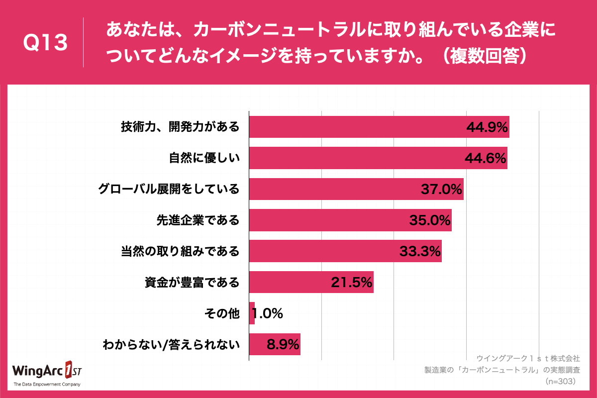 「Q13.あなたは、カーボンニュートラルに取り組んでいる企業についてどんなイメージを持っていますか。(複数回答)」(n=303)と質問したところ、「技術力、開発力がある」が44.9%、「自然に優しい」が44.6%、「グローバル展開をしている」が37.0%という回答となりました。