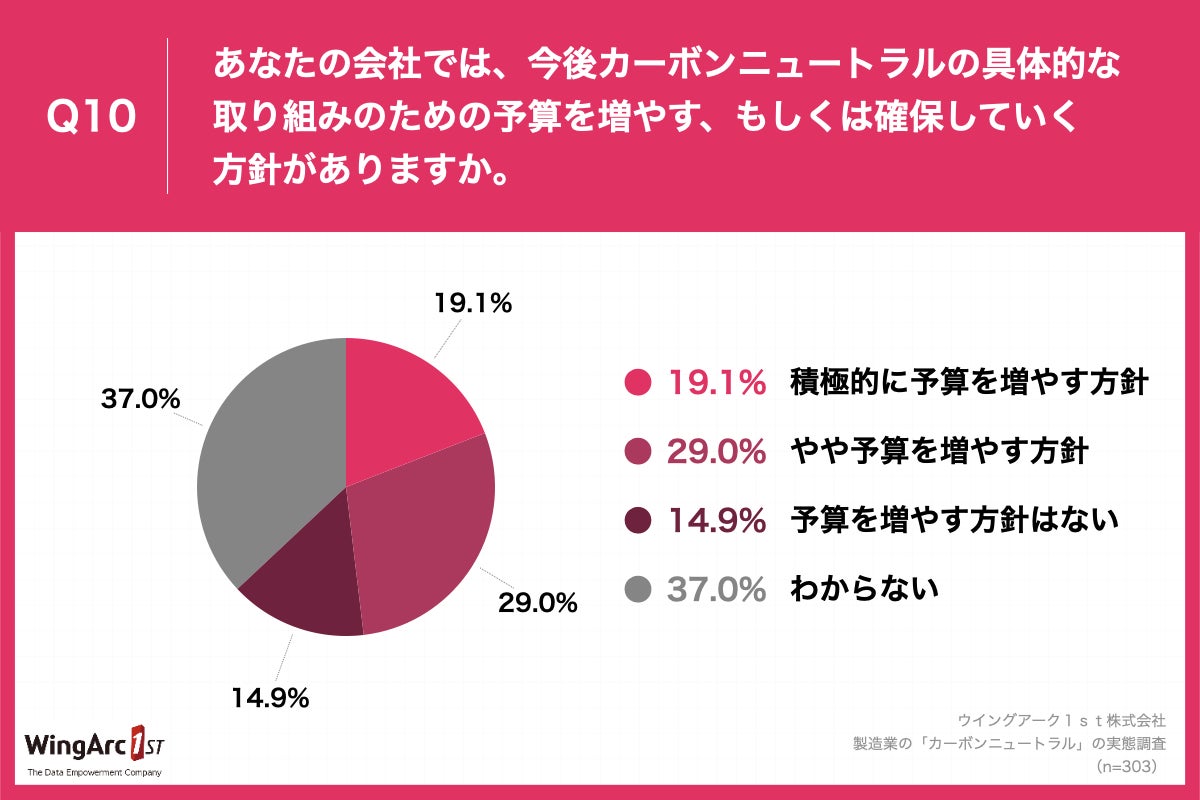 「Q10.あなたの会社では、今後カーボンニュートラルの具体的な取り組みのための予算を増やす、もしくは確保していく方針がありますか。」(n=303)と質問したところ、「積極的に予算を増やす方針」が19.1%、「やや予算を増やす方針」が29.0%という回答となりました。