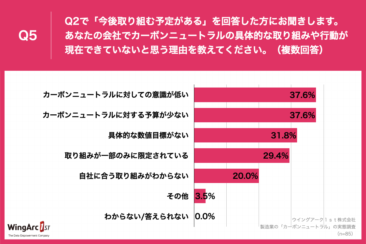 Q2で「今後取り組む予定がある」と回答した方に、「Q5.あなたの会社でカーボンニュートラルの具体的な取り組みや行動が現在できていないと思う理由を教えてください。(複数回答)」(n=85)と質問したところ、「カーボンニュートラルに対しての意識が低い」が37.6%、「カーボンニュートラルに対する予算が少ない」が37.6%、「具体的な数値目標がない」が31.8%という回答となりました。