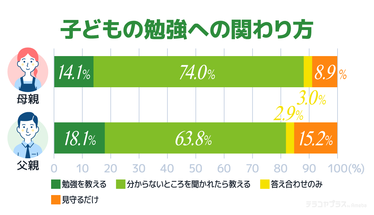 また、母親より父親の方が「勉強を教える」(18.1%)と「見守るだけ」(15.2%)の割合が高く、父親は勉強を見る頻度が少ない中でどのように関わるべきかを模索している様子もうかがえました。