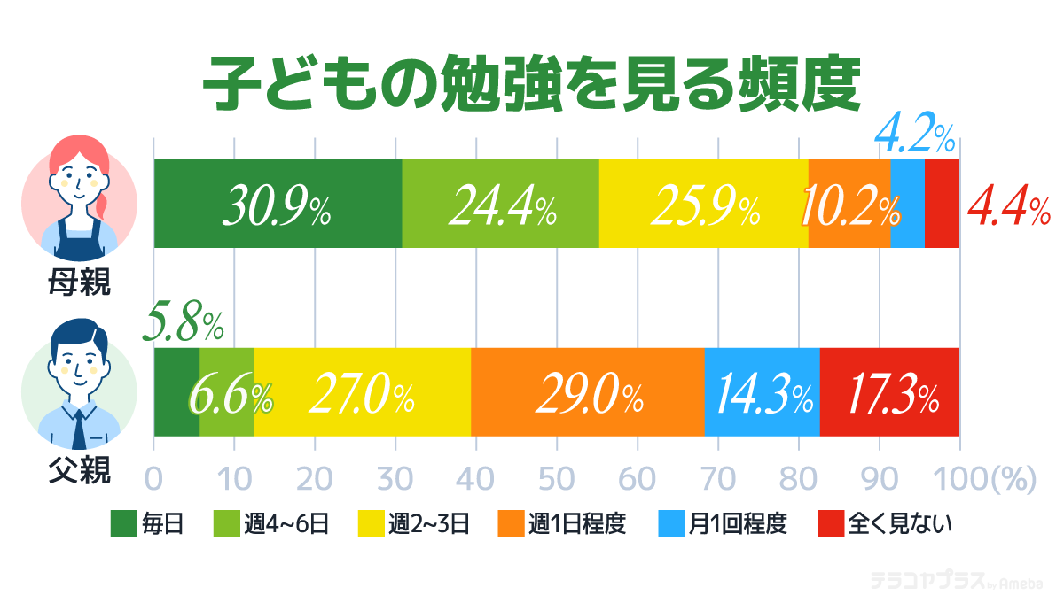 では、現実にはどの程度関わっているのでしょうか。子どもの勉強を見る頻度や関わり方について尋ねたところ、母親と父親でその頻度に大きな差が出ました。