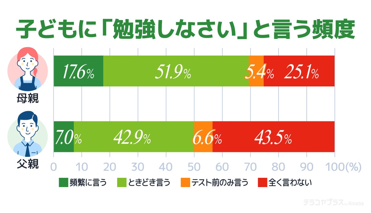 - 「自分が子どものとき、頻繁に『勉強しろ』と言われたので、子どもには極力そういったことは言わないようにしています」(20代後半・小学6年生の父親)