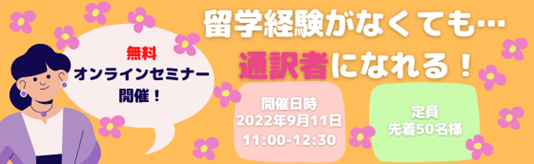 今回は、コロナ禍に円安にと留学をしづらい時代だからこそ、「通訳に興味がある」「英語を使って仕事をしたい」という方へ向けて、無料セミナーをご用意致しました。