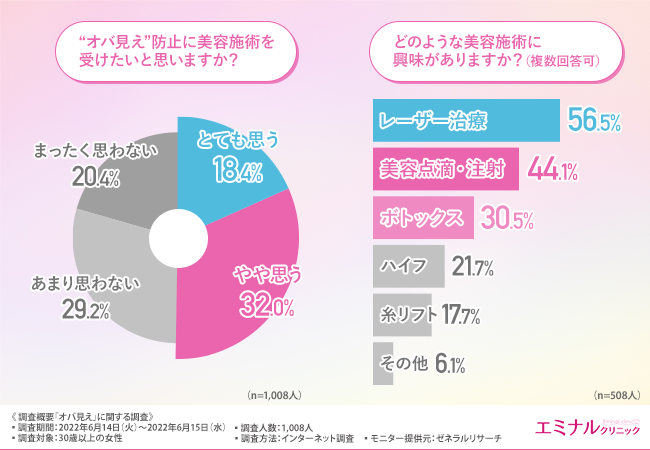 さらに、“オバ見え”を防止するために約半数の方が美容施術を受けてみたいと感じており、レーザー治療をはじめ、美容点滴・注射、ボトックスに関心を持っていることがわかりました。