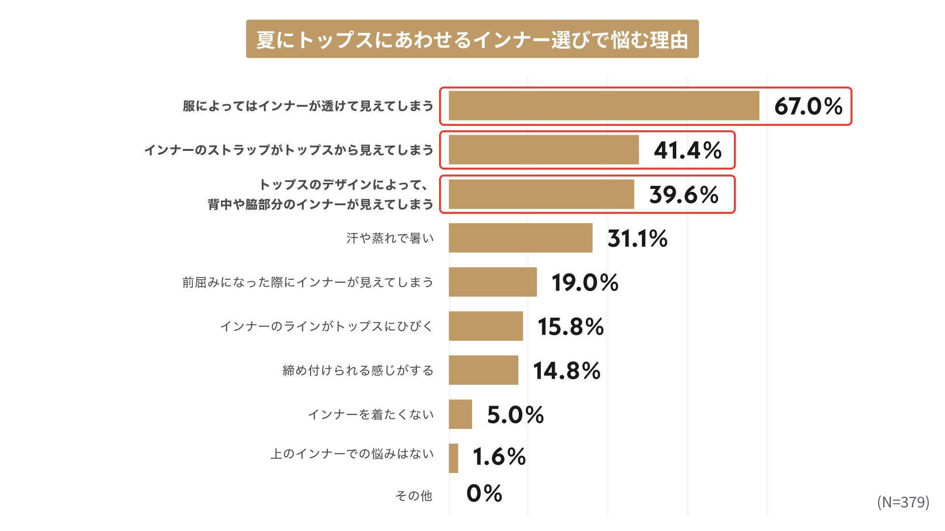 このことから、色の薄いトップスや、肌が出る涼しげな夏らしいトップスとあわせるインナー選びが難しいことがわかりました。
