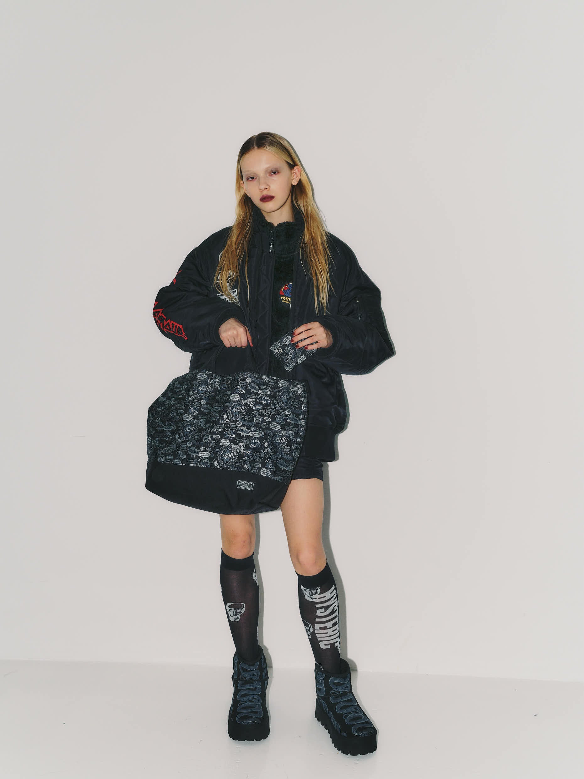 アメリカンポップアートのエッセンスを取り入れたHYSTERIC GLAMOURらしいデザインのメイン素材は、高密度に織りあげたポリエステルジャカードで繊細に表現しています。日本で古くからジャカード織物を生産している職人が手掛けた立体感のある柄が特徴で、細かく織り込まれた生地はイラストの様な精密さをしています。