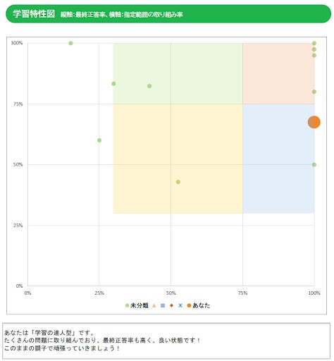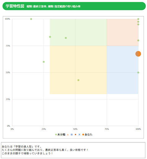 クラス全員の「取組度」と「最終正答率」を可視化することで、自分の相対的な位置を把握できるようにします。自分の状況によって、自分の「学習タイプ」が診断されます。次の学習のためのアドバイスもコメントで表示されます。