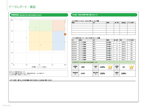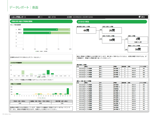 リブリーは「自律的」に学べるようなこどもたちを育てたいと考えています。これからの教育において、生徒自身が自分の状況を正しく把握し、自分の学びを主体的に進めることの重要性は増す一方です。学習データレポートを活用した自己調整学習の促進は学習指導要領の方向性とも合致しています。生徒と教育者の双方を支援できるよう、データレポート機能の開発をいたしました。