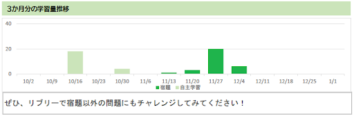 週ごとの学習量の変化を可視化します。宿題以外の問題の取組量なども可視化されるため、主体的な学習の状況も確認できます。