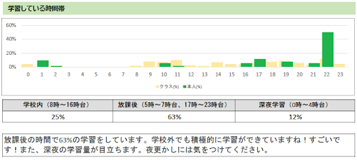 1日24時間のどの時間帯によく学習しているかの比率を可視化します。時間帯別の”比率”が表示されるので生活習慣を他者と比較する良いきっかけになります。また、深夜学習が全体の10%を超えると、健康に気遣うコメントが表示されます。