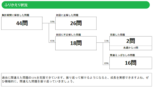 自身の学習状況の”全体像”を可視化します。自分が解いた問題に対して、初回に不正解した問題の中で「間違えっぱなしにしている問題」がどれくらいあり、「正解できるまで取り組んだ(克服した)問題」がどれくらいあるかを可視化します。先生はこのデータをもとに、主体的に学習に取り組む態度を定量的に評価することが可能です。