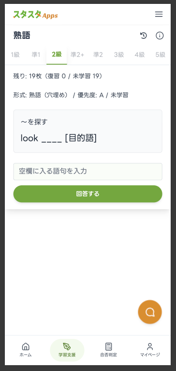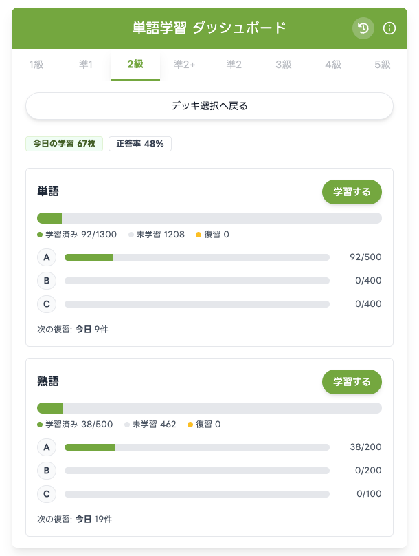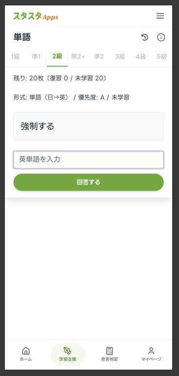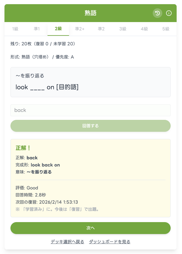 入力して思い出す想起型×間隔反復スケジューラで復習を自動化。単語1,300/熟語500(2級)を優先度A/B/Cで学習可能
