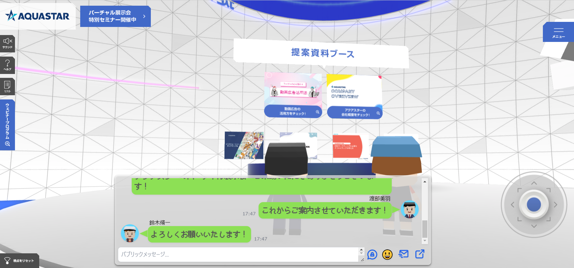 イラストやデジタルコンテンツの企画・制作を行う株式会社アクアスター (所在地:東京都中央区、代表取締役社⻑:原⽥ 弘良、以下 当社)は、2023年 9月5日から 9月20日までの期間、メタバース空間を活用した企業向けバーチャル展示会「第4回 デジタルコミュニケーションバーチャル展示会~デジタル×ビジュアルの最新事例~」(以下本展示会)を開催いたします。