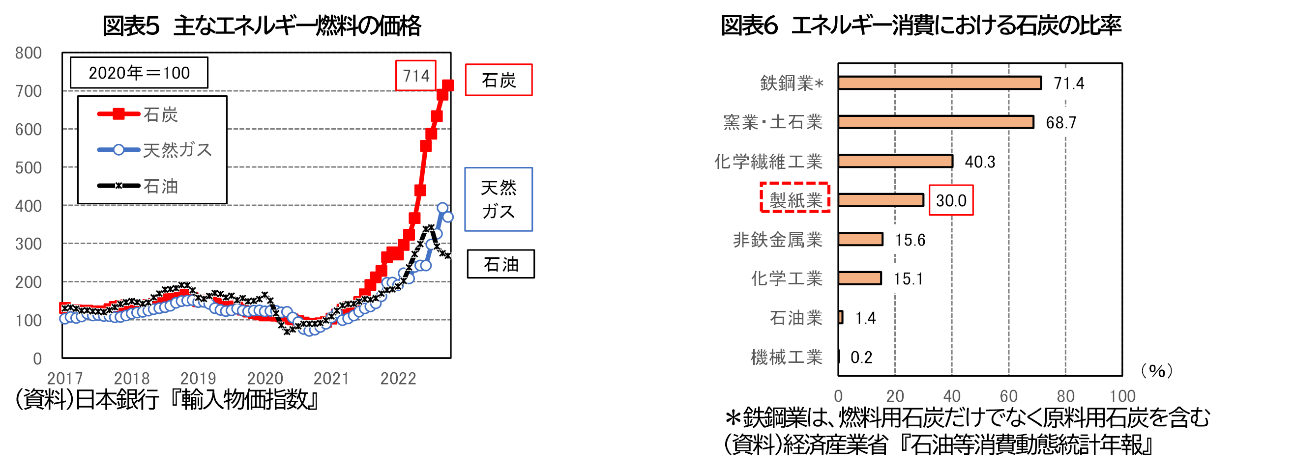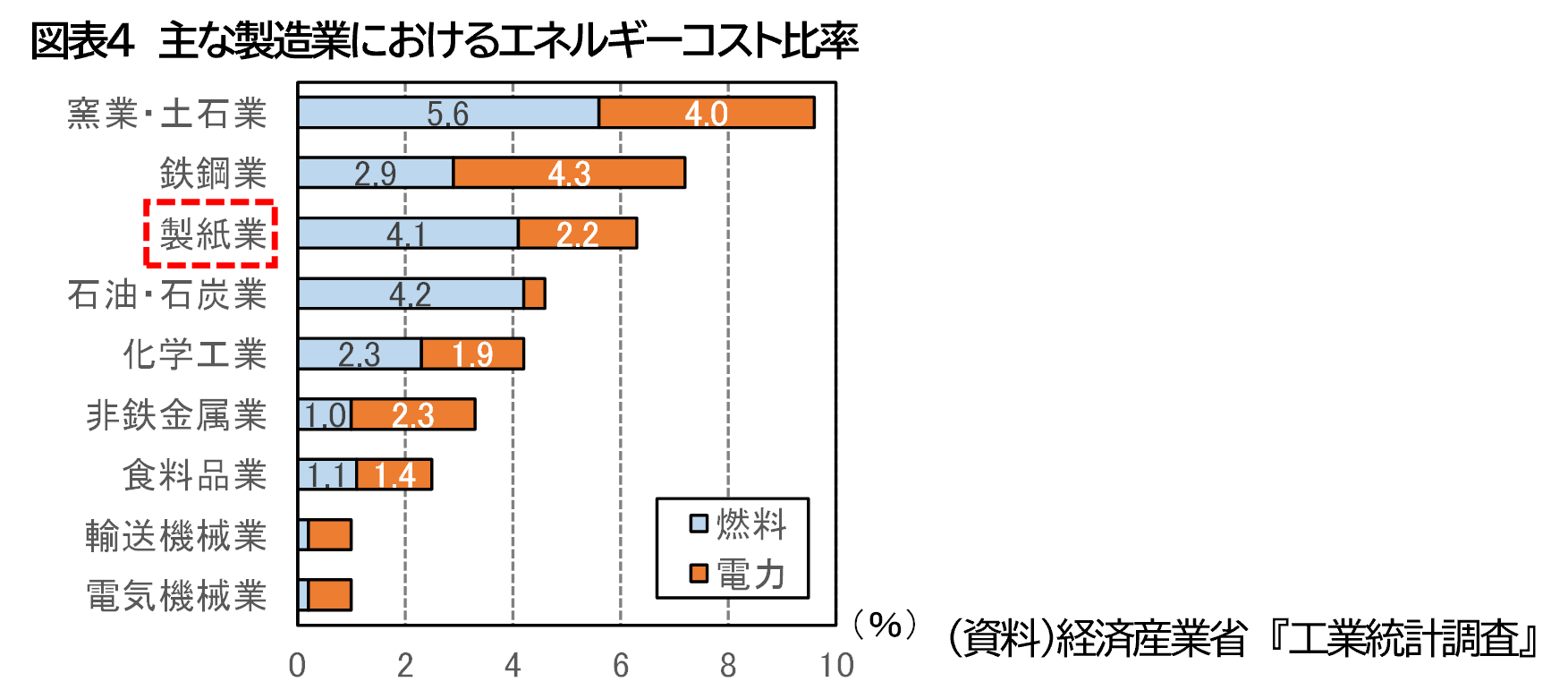 図表4は、主な製造業におけるエネルギーコストの負担度合いを比較するため、生産額に占めるエネルギーコストの比率を並べたものである。これをみると、営業利益の減少率が最も大きかった製紙業の同比率6.3%(燃料4.1%+電力2.2%)は、窯業・土石業の同9.6%(燃料5.6%+電力4.0%)、鉄鋼業の同7.2%(燃料2.9%+電力4.3%)に次ぐ3番目に高い水準である。