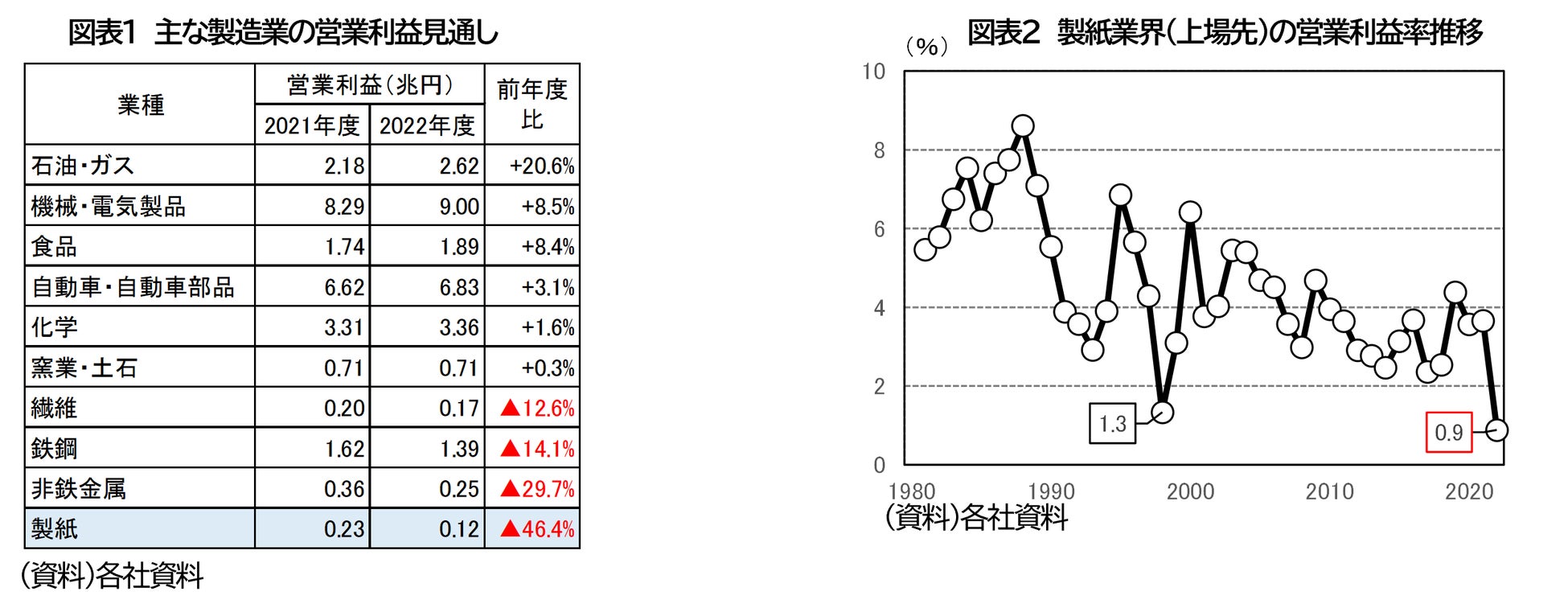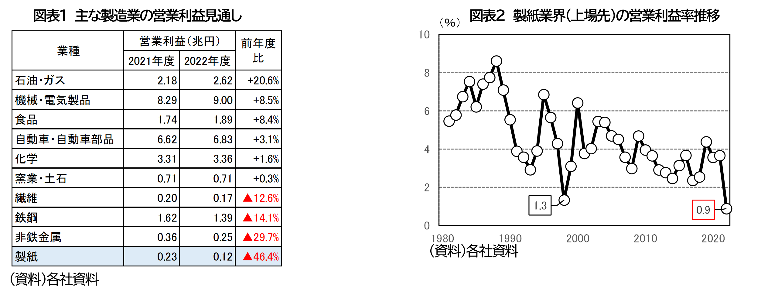 図表1は、東京証券取引所プライム市場に上場する主な製造業の2022年度通期営業利益見通しである。これをみると、業種によって利益増減率に大きな差が出ていることが分かる。具体的には、石油・ガスの営業利益の前年度比増加率が+20.6%と最も高かった一方、製紙の同減少率は▲46.4%であった。製紙業の2022年度見込みベースの営業利益率0.9%は、1980年以降のおおよそ40年間で最も低い水準になるとみられる(図表2)。