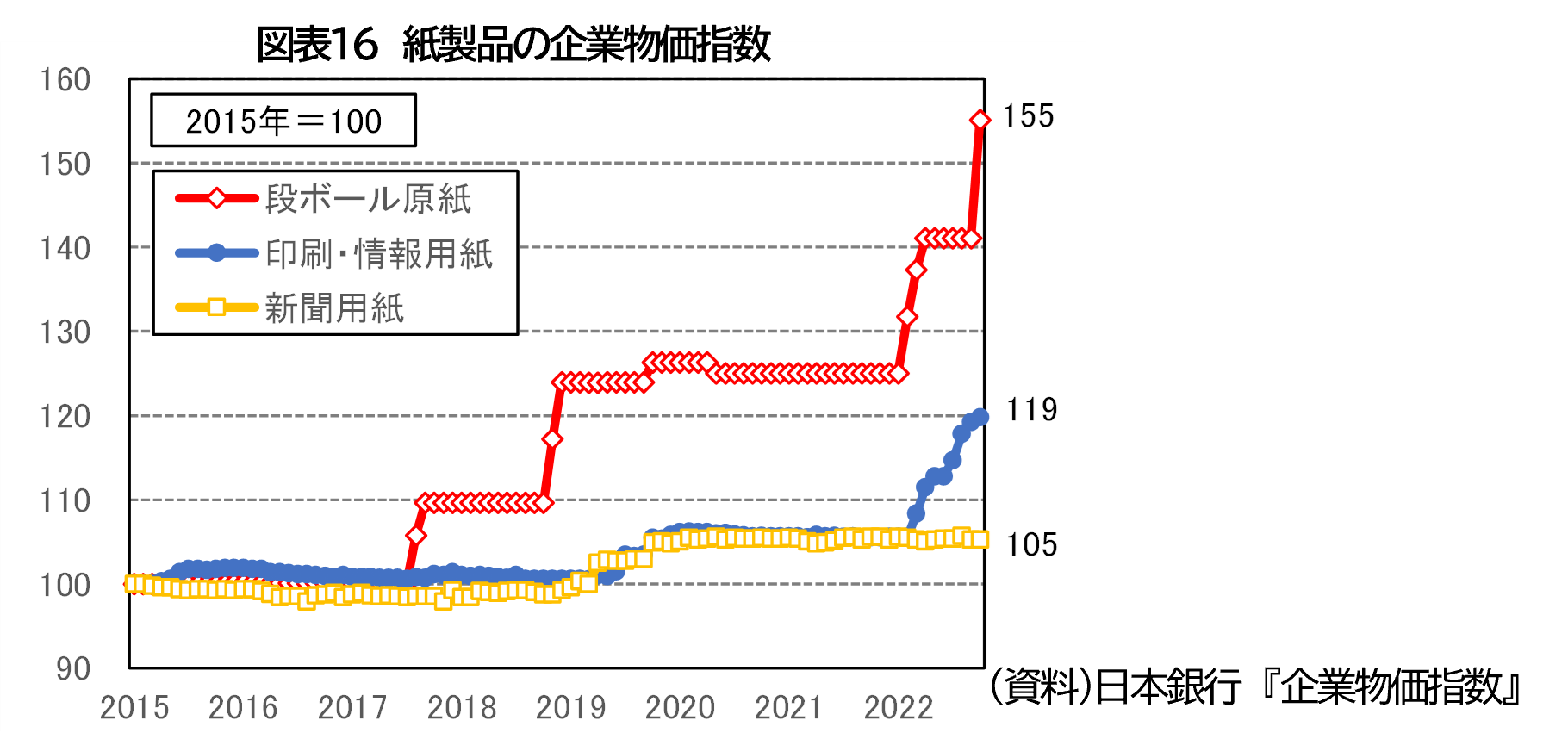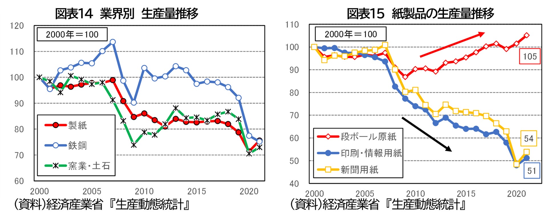 以下では、これまで製紙業界が行ってきた主要製品の構成見直しなど利益確保の取組みについて振り返る。図表14は2000年を基準とした製紙、鉄鋼、窯業・土石の各産業における生産量の推移である。製紙業は2008年のリーマンショック以降に大きく減少した後、回復しないまま、コロナ禍により一段と減少した。但し、製紙業の主要製品別の内訳をみると、印刷・情報用紙や新聞用紙が減少している一方、段ボール原紙は増加している(図表15)。