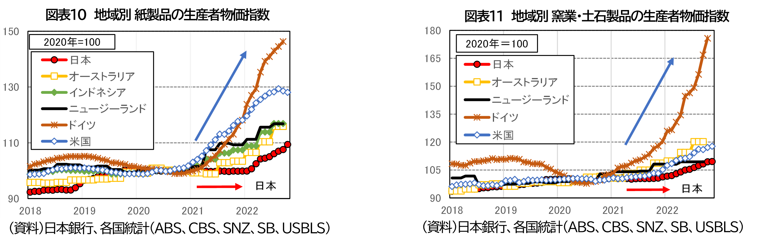 さらに紙や窯業・土石の製品価格については、国内外で足元の上昇トレンドに差異がみられる。図表10と11は、国内外の製紙業や窯業・土石業の製品価格の目安として、それぞれの生産者物価指数を主要国別の推移にして比較したものである。これをみると、図表10の紙製品、図表11の窯業・土石製品とも、日本における価格上昇タイミングの遅れが目立つ。反対にその他の一部の国では、石炭価格の上昇と同時期の2021年初頃から製品価格が上昇し、その上昇幅は日本より大きい。日本よりも価格転嫁のペースが早いことがわかる。