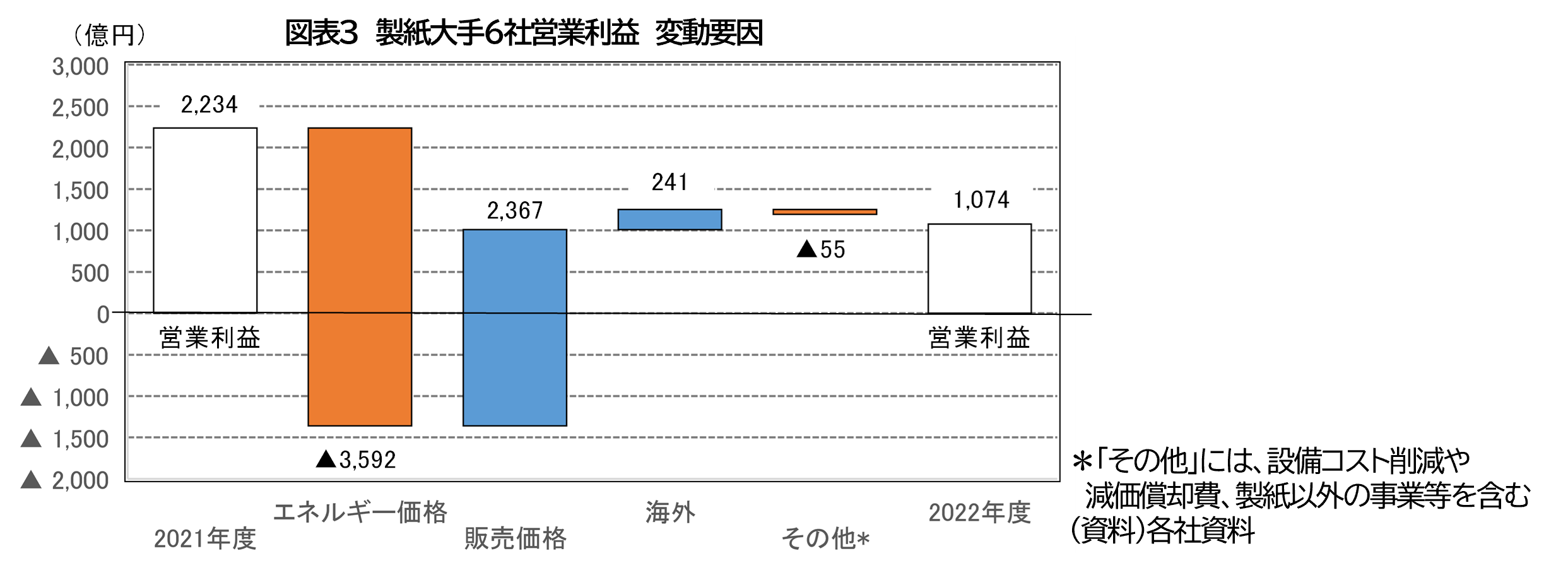 営業利益の減少率が最も大きかった製紙業では、どのような要因がマイナスに影響したのであろうか。上場する大手製紙企業6社[1]の2022年度決算見通しにおける営業利益変動要因を確認した。図表3は、2021年度と2022年度の通期営業利益の増減要因を、主なプラス要素とマイナス要素に分解したものである。これをみると、エネルギー費用増加による▲3,592億円のマイナス要素が、利益減少の主要因となることが一目瞭然である。販売価格引き上げによる+2,367億円のプラス要素もあるものの、エネルギー費用増加に打ち消されている。