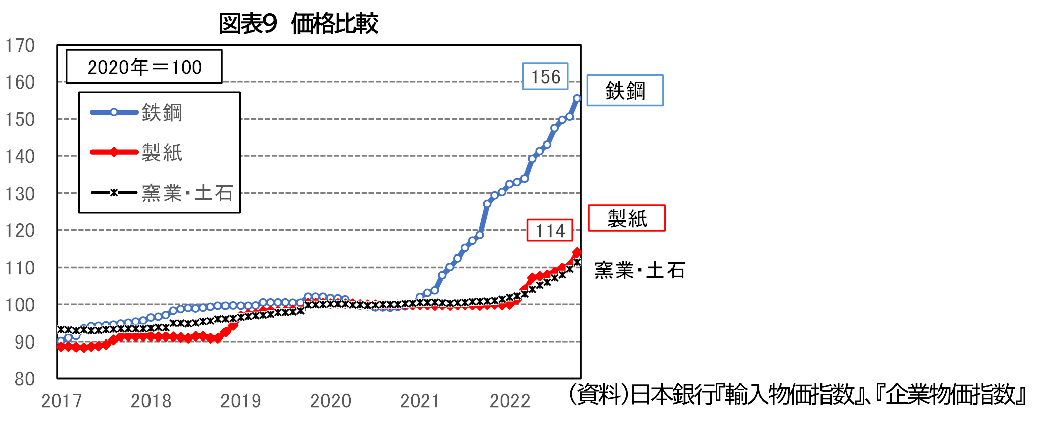 次にエネルギーコスト比率の高い上位3業種、窯業・土石、鉄鋼、製紙について、主要製品の価格[2]がどのように推移してきたのか比較するため、それぞれの企業物価指数の推移を確認した(図表9)。それによると、エネルギーコストが高騰した直近数年においては、製紙ならびに窯業・土石業の企業物価推移と、鉄鋼の企業物価推移との間にトレンドの違いを見て取れる。具体的には鉄鋼の企業物価指数が上昇カーブをやや強めてきたのに対し、製紙ならびに窯業・土石業の企業物価指数はほぼ横ばいである。これらの業種では、コスト増の下でも販売価格への転嫁が進まずに収益が圧迫されたことが窺える。