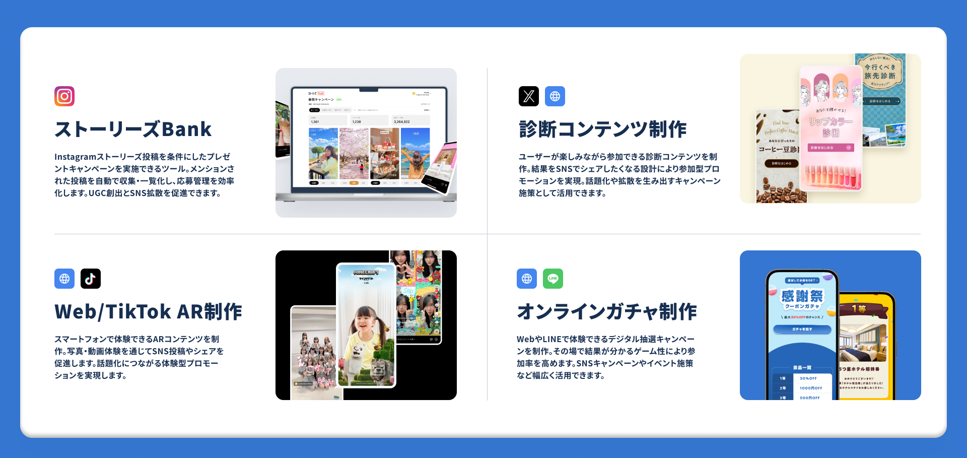 これまで本サービスでは、Instagramストーリーズ投稿キャンペーン、診断コンテンツ、TikTok ARエフェクト、WebAR施策などに対応してきました。