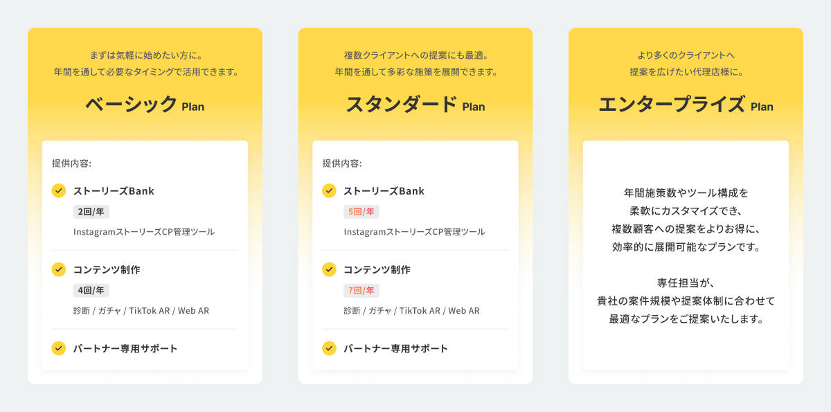 本サービスは年間契約でご利用いただけます。初期費用は不要で、プランに応じて利用できる施策回数に上限が設定されています。