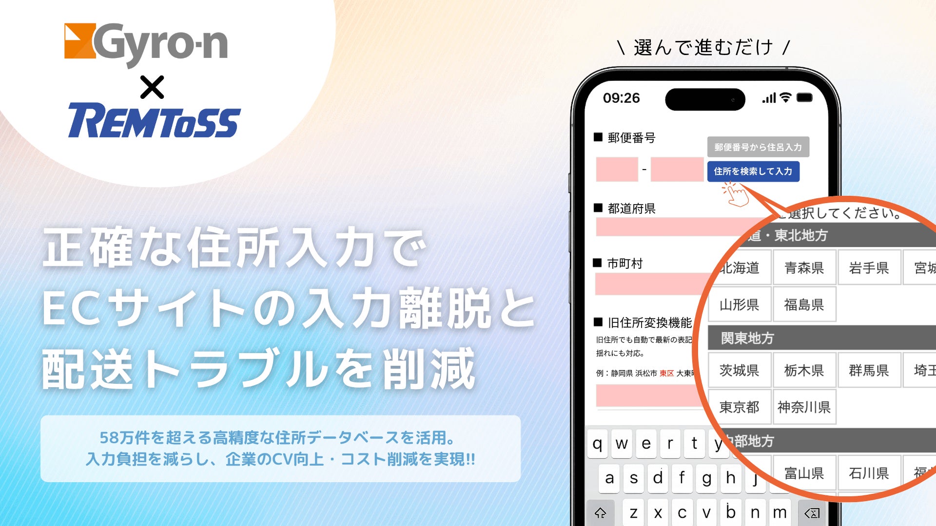 ECサイトの住所入力課題を解決!「Gyro-n EFO」とレムトス社の連携で、正確な住所入力機能を提供開始。高精度データとAIクリーニングにより、ユーザー負担軽減と誤入力トラブル回避を実現。フォーム離脱・誤配送を減らし、CVR向上とコスト削減に貢献します。